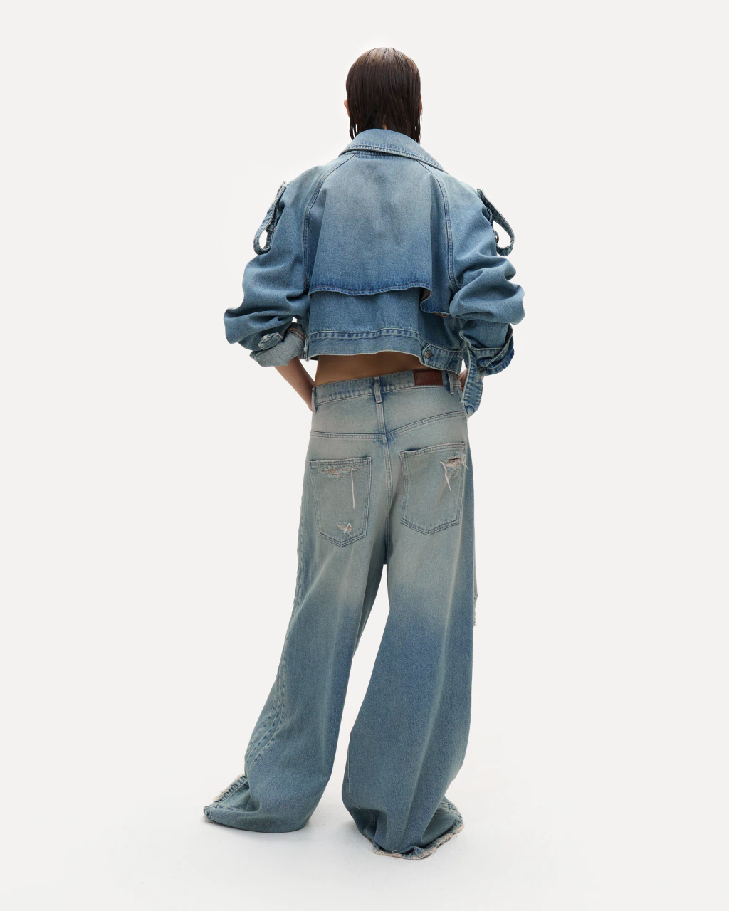 Jean tiro alto fit wide leg con roturas en las rodillas.